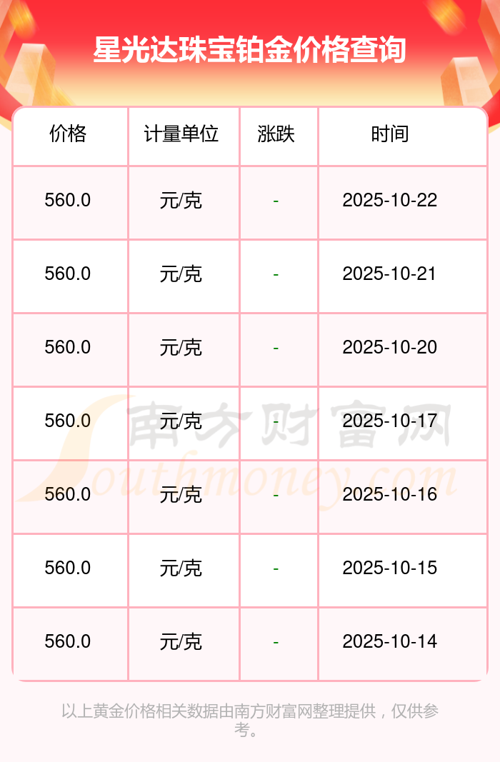 星光達(dá)珠寶鉑金價(jià)格現(xiàn)在每克多少錢(qián)呀,最新星光達(dá)珠寶鉑金價(jià)格表(2025年10月23日)