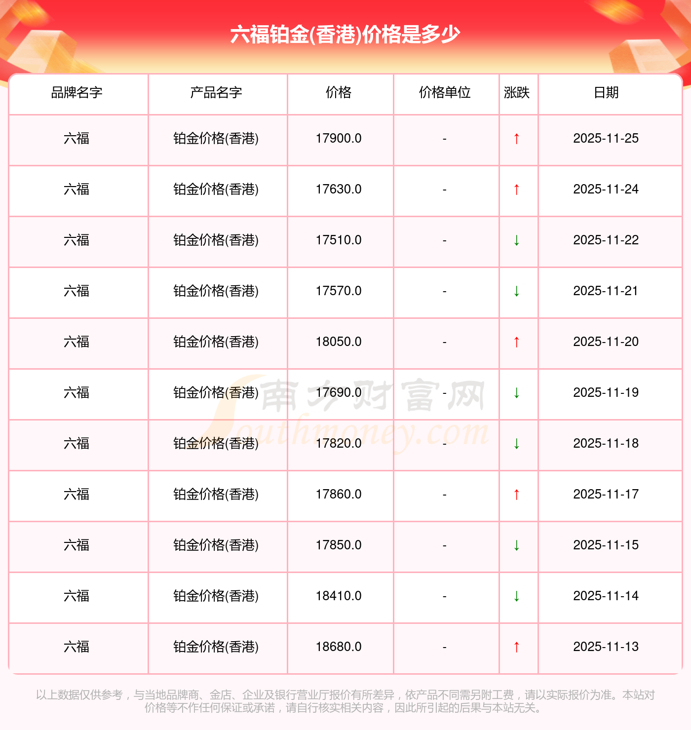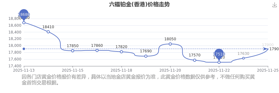 六福 鉑金價(jià)格(香港)在今日的最新價(jià)格顯示為17900.0。