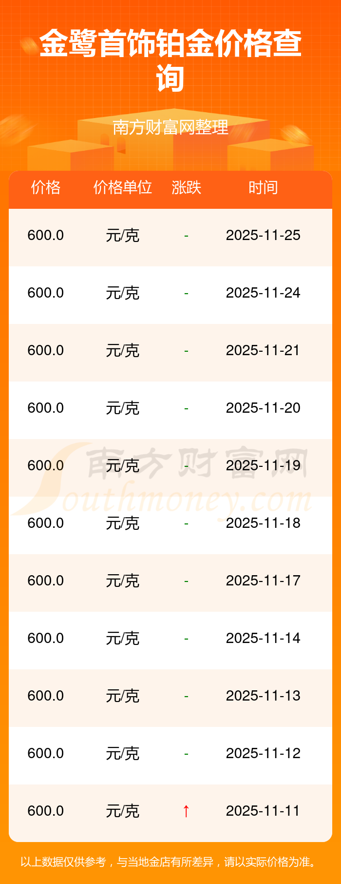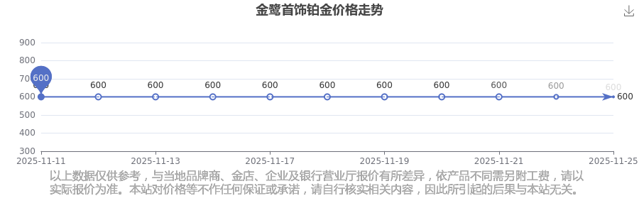 金鷺首飾今日 鉑金價(jià)格的最新市場(chǎng)行情價(jià)為600.0元/克。