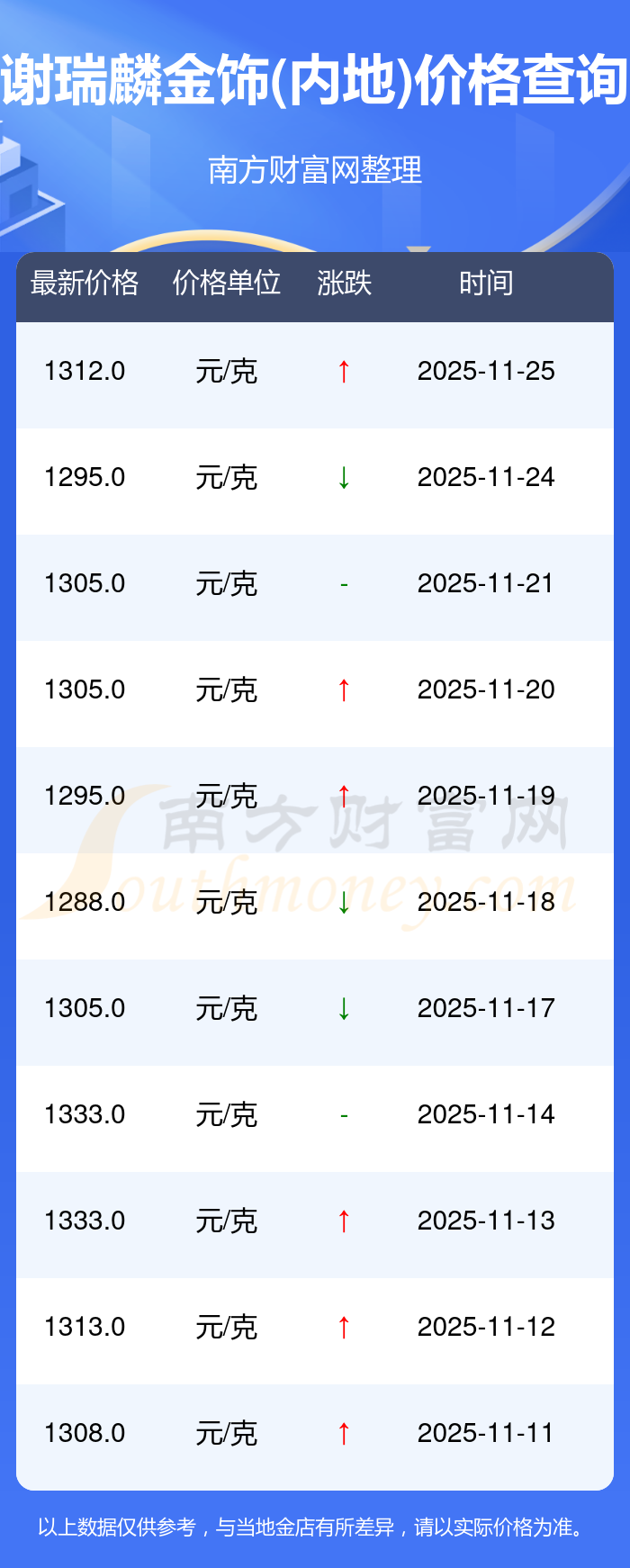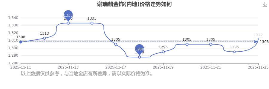 據(jù)了解,今日謝瑞麟 金飾價格(內(nèi)地)的最新價格為1312.0元/克。