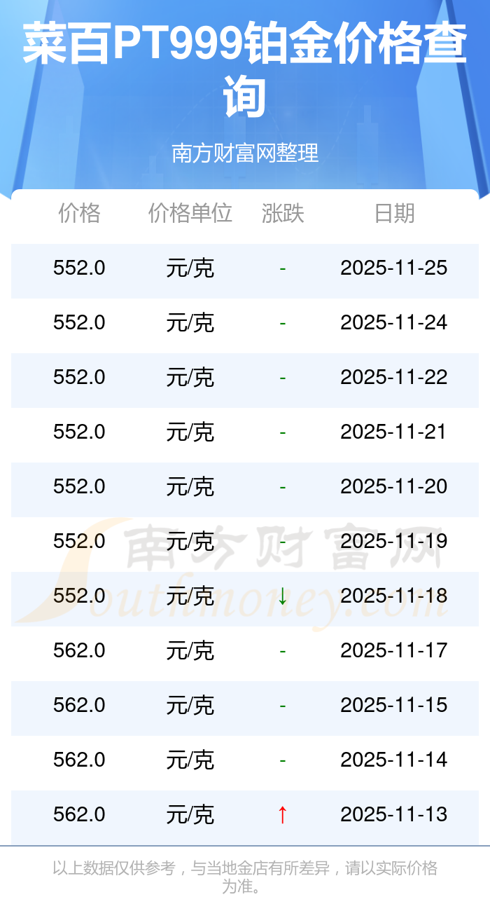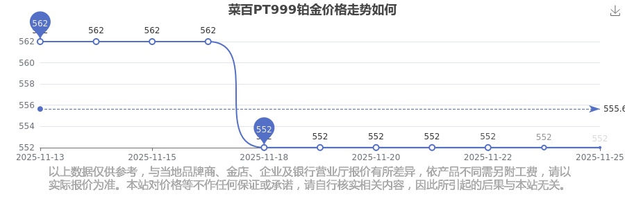 據(jù)了解,今日菜百 PT999鉑金的最新價(jià)格為552.0元/克。