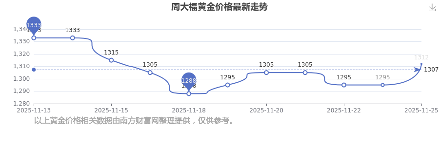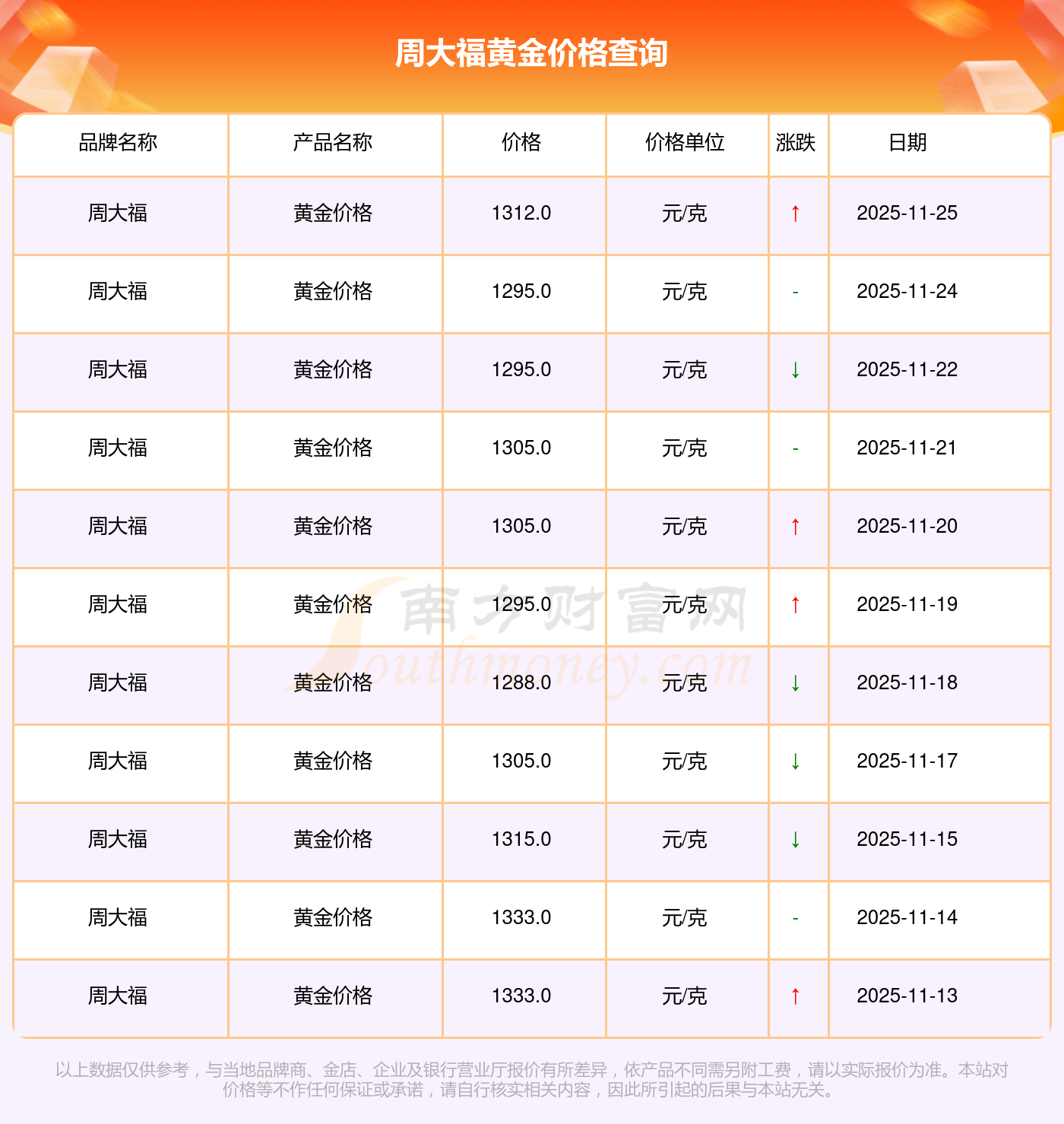今日黃金價(jià)格查詢_現(xiàn)在金價(jià)黃金一克多少錢,黃金價(jià)格是多少錢一克?黃金每一克的價(jià)格通常在多少數(shù)值左右?2025年11月26日周大福黃金價(jià)格最新為1312.0元/克。