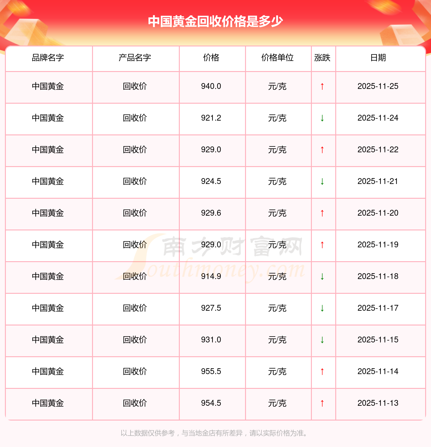 中國黃金 回收價于今日的最新掛牌價為940.0元/克。