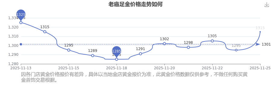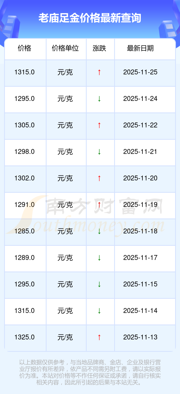 今日(2025年11月26日)老廟足金價(jià)格的價(jià)格為1315.0元/克。