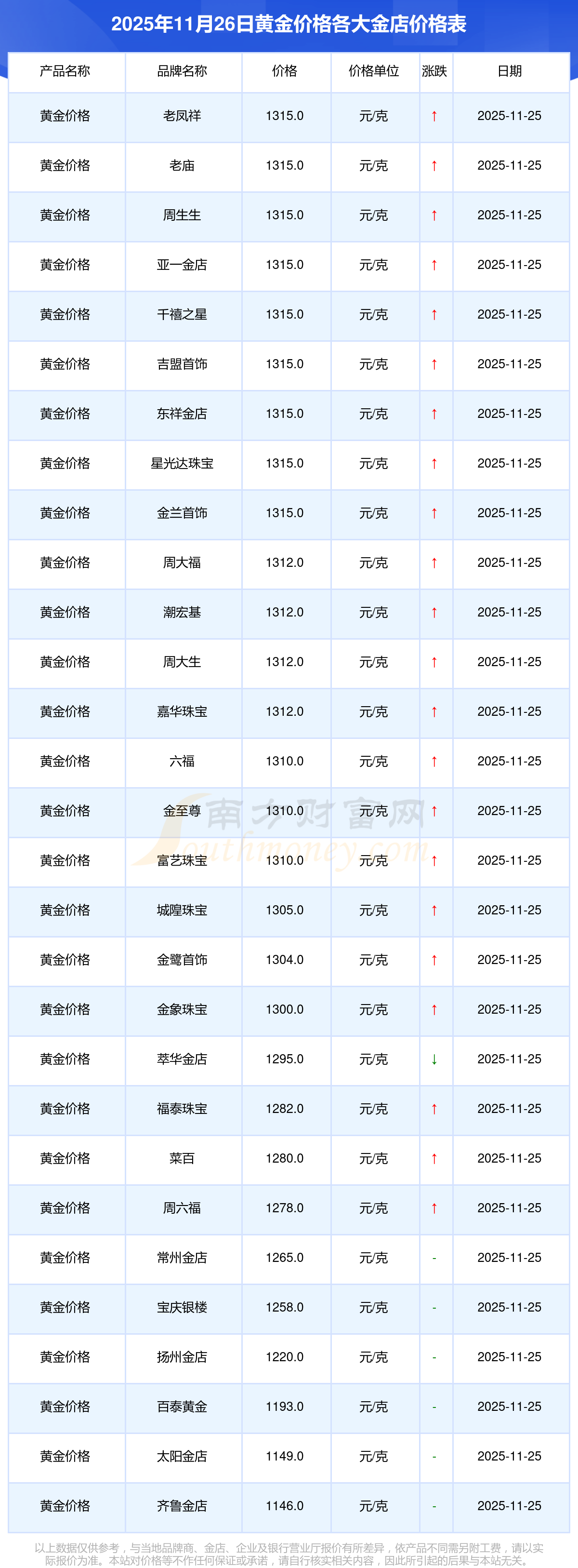 2025年11月26日各大金店黃金價格最新價格:周大福1312.0元/克,周大福627.0元/克,周大福1312.0元/克,周大福45780.0,周大福17900.0,周大福41290.0,周大福1148.0元/克,老鳳祥1315.0元/克,老鳳祥600.0元/克,老鳳祥1315.0元/克,周六福1278.0元/克。