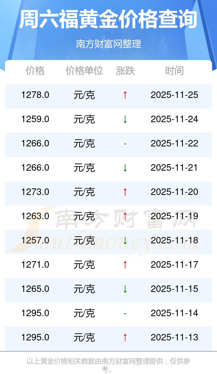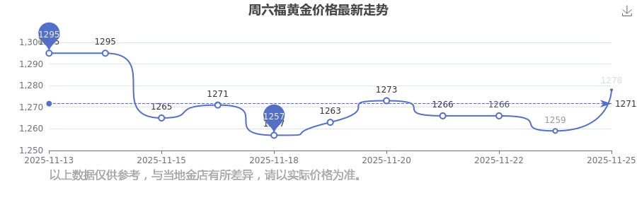 今日周六福 黃金價(jià)格最新的市場(chǎng)標(biāo)價(jià)為1278.0元/克。