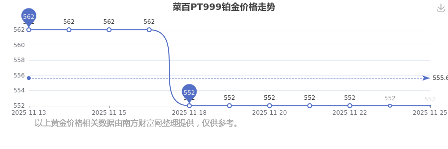 菜百 PT999鉑金今日最新的價(jià)位是552.0元/克。
