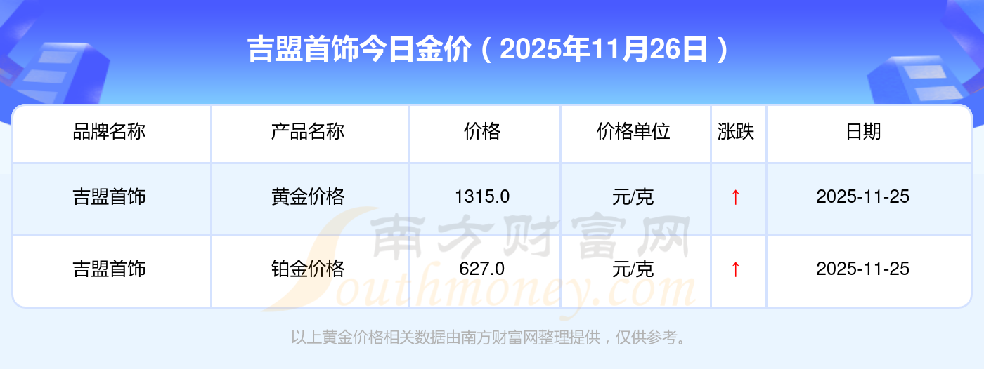 現(xiàn)在吉盟首飾黃金價(jià)格是多少錢1克_2025年吉盟首飾今日金價(jià)是多少錢一克,最新吉盟首飾查詢,2025年11月26日吉盟首飾鉑金價(jià)格現(xiàn)在每克多少錢?最新吉盟首飾鉑金價(jià)格報(bào)價(jià)公布,一起來(lái)看看吧!