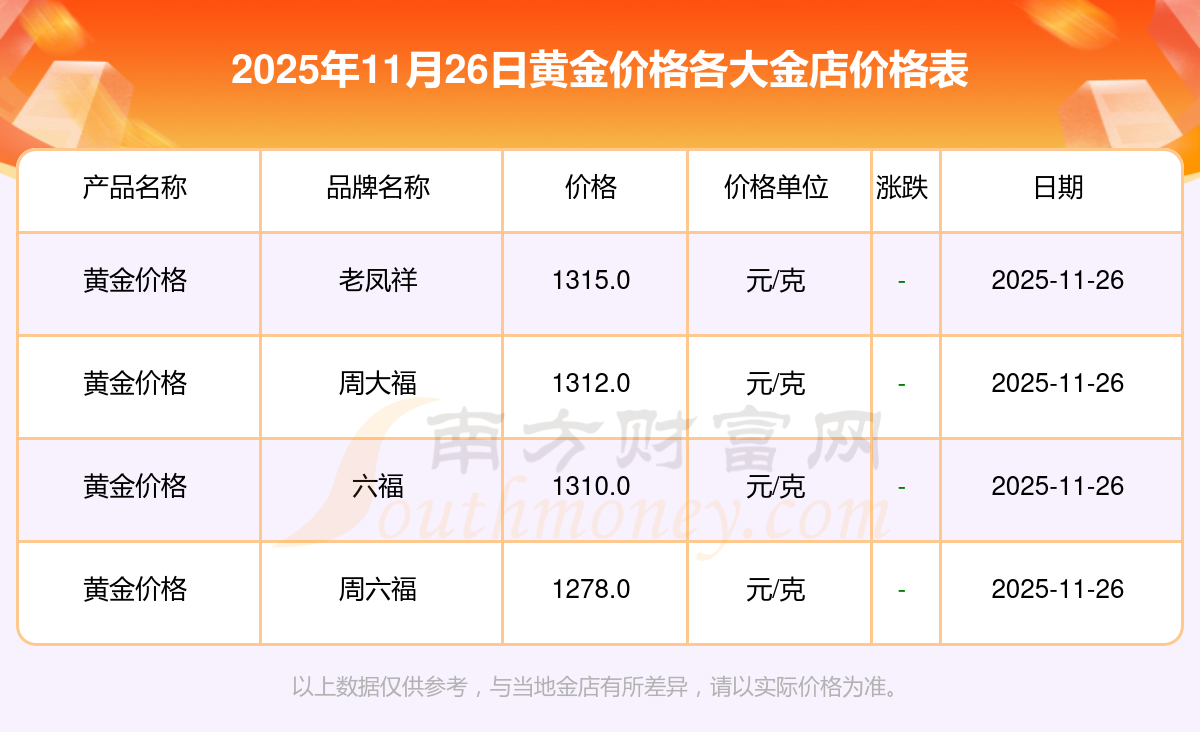 2025年11月26日各大金店黃金價(jià)格最新價(jià)格:周大福1312.0元/克,周大福624.0元/克,周大福1312.0元/克,周大福45880.0,周大福17860.0,周大福41380.0,周大福1148.0元/克,老鳳祥1315.0元/克,老鳳祥600.0元/克,老鳳祥1315.0元/克,周六福1278.0元/克。