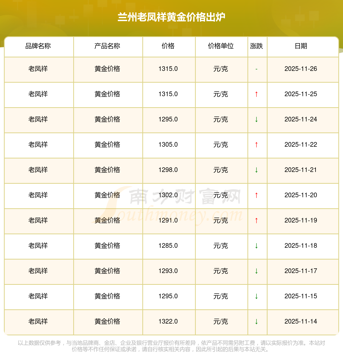 2025年11月26日,今日蘭州老鳳祥黃金價(jià)格:1315.0元/克。