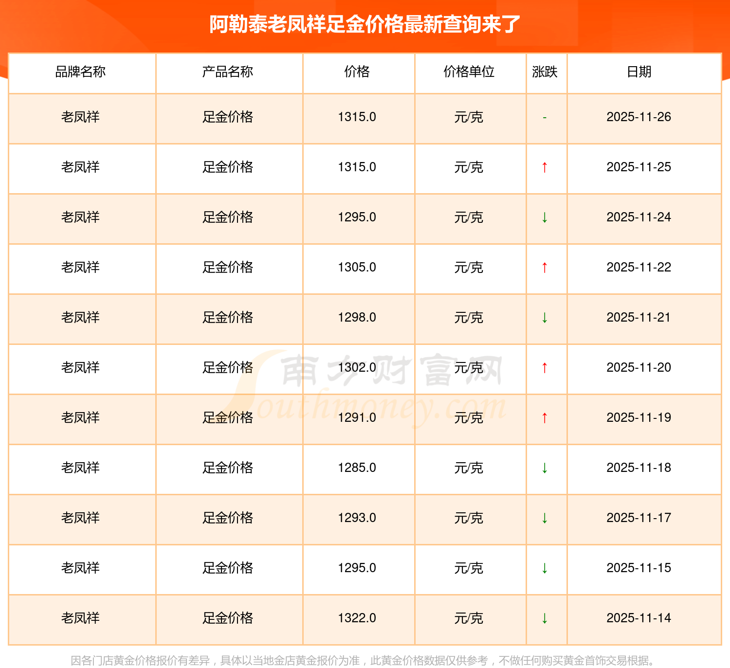 今日阿勒泰老鳳祥足金價格為1315.0元/克。
