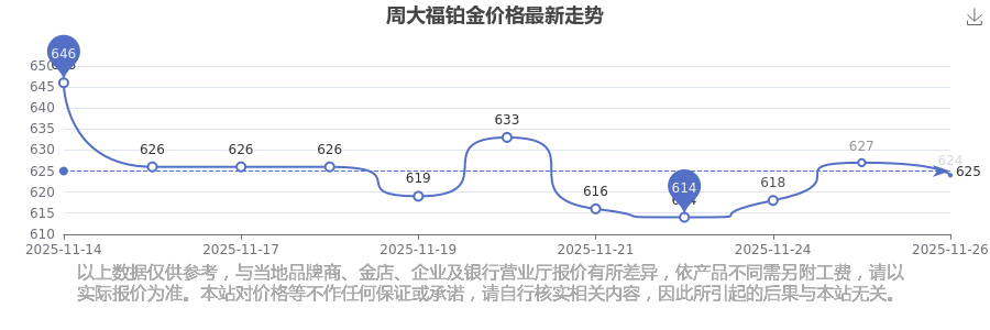 今日(2025年11月26日)周大福鉑金價格為624.0元/克。