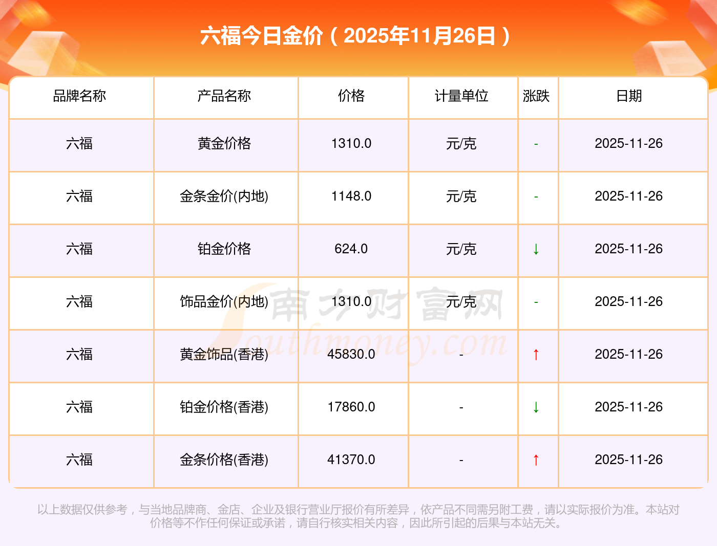 2025年11月26日六福今日價(jià)格:黃金價(jià)格1312.0元/克,鉑金價(jià)格624.0元/克,飾品金價(jià)(內(nèi)地)1312.0元/克,黃金飾品(香港)45880.0,鉑金價(jià)格(香港)17860.0,金條價(jià)格(香港)41380.0,金條金價(jià)(內(nèi)地)1148.0元/克,黃金價(jià)格1315.0元/克,鉑金價(jià)格600.0元/克,足金價(jià)格1315.0元/克,黃金價(jià)格1278.0元/克。