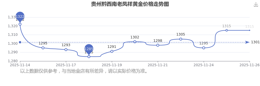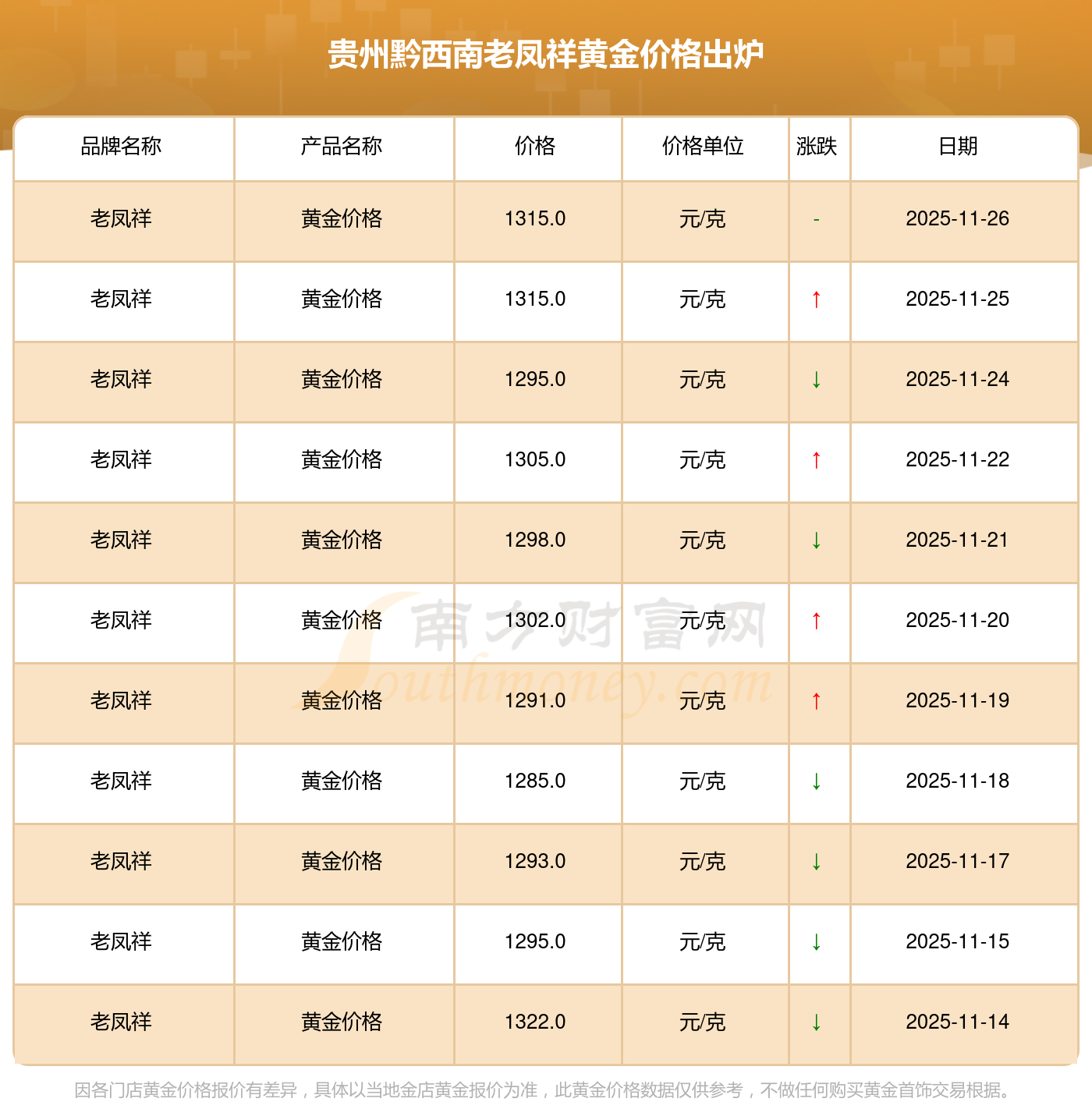2025年11月26日,貴州黔西南老鳳祥黃金價(jià)格每克的售賣價(jià)位為1315.0元/克。