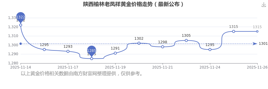 2025年11月26日這一天,陜西榆林老鳳祥的黃金價(jià)格以 1315.0元/克的價(jià)格售賣。