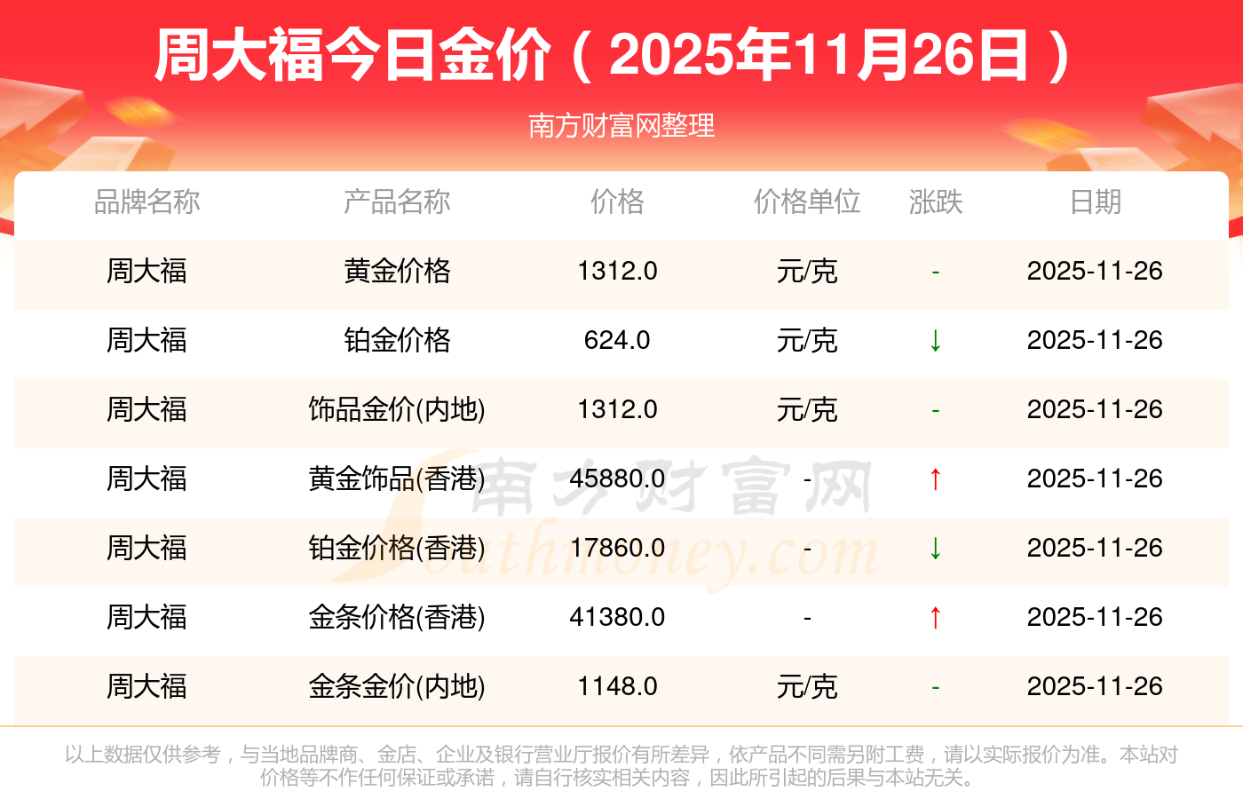 因各門店黃金價(jià)格報(bào)價(jià)有差異,具體以當(dāng)?shù)亟鸬挈S金報(bào)價(jià)為準(zhǔn),此黃金價(jià)格數(shù)據(jù)僅供參考,不做任何購買黃金首飾交易根據(jù)。