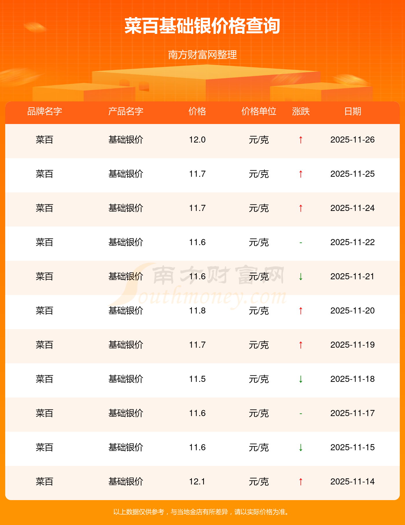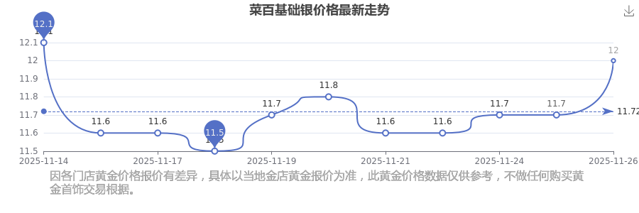 今日菜百基礎(chǔ)銀價(jià)格為12.0元/克。