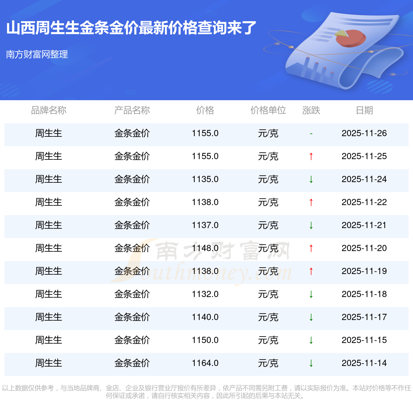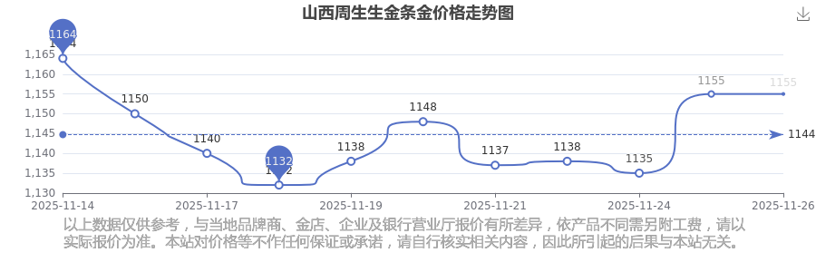 今日山西周生生金條金價的價格為1155.0元/克。