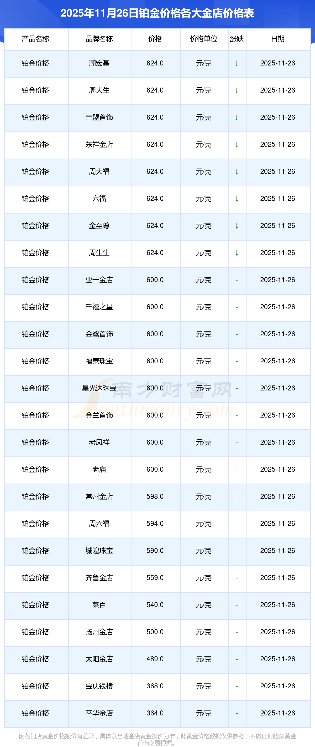 今天是2025年11月26日,周生生、潮宏基、潮宏基、周大生、周大生、亞一金店、亞一金店、寶慶銀樓、寶慶銀樓、太陽金店、太陽金店等各大金店品牌鉑金價(jià)格最新價(jià)格如下:周生生1155.0元/克、潮宏基1312.0元/克、潮宏基624.0元/克、周大生1312.0元/克、周大生624.0元/克、亞一金店1315.0元/克、亞一金店600.0元/克、寶慶銀樓1258.0元/克、寶慶銀樓368.0元/克、太陽金店1149.0元/克、太陽金店489.0元/克。