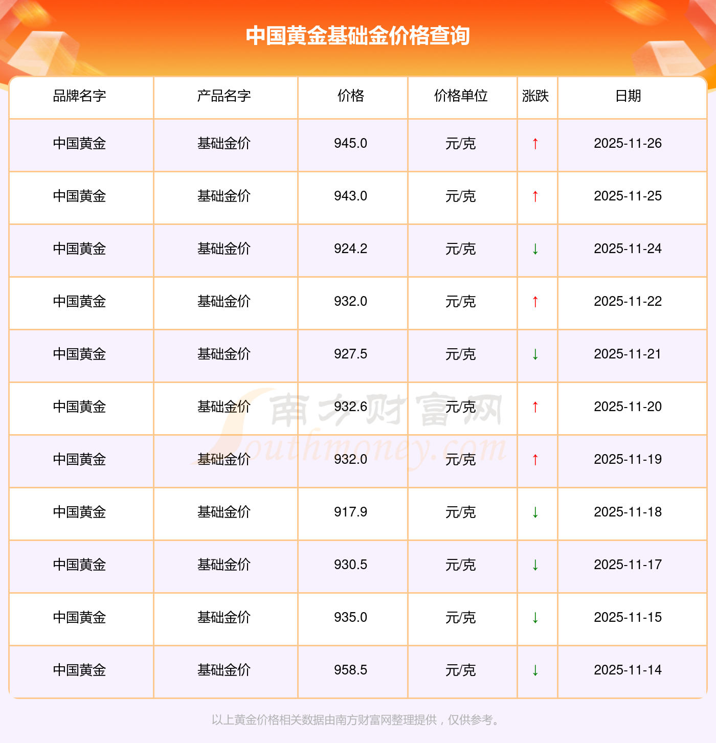 以上數(shù)據(jù)僅供參考,與當(dāng)?shù)仄放粕、金店、企業(yè)及銀行營(yíng)業(yè)廳報(bào)價(jià)有所差異,依產(chǎn)品不同需另附工費(fèi),請(qǐng)以實(shí)際報(bào)價(jià)為準(zhǔn)。本站對(duì)價(jià)格等不作任何保證或承諾,請(qǐng)自行核實(shí)相關(guān)內(nèi)容,因此所引起的后果與本站無(wú)關(guān)。