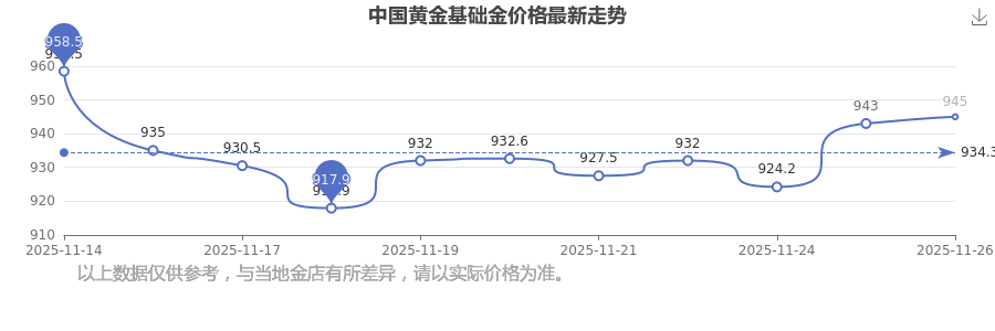 今日中國(guó)黃金基礎(chǔ)金價(jià)的價(jià)格是945.0元/克。