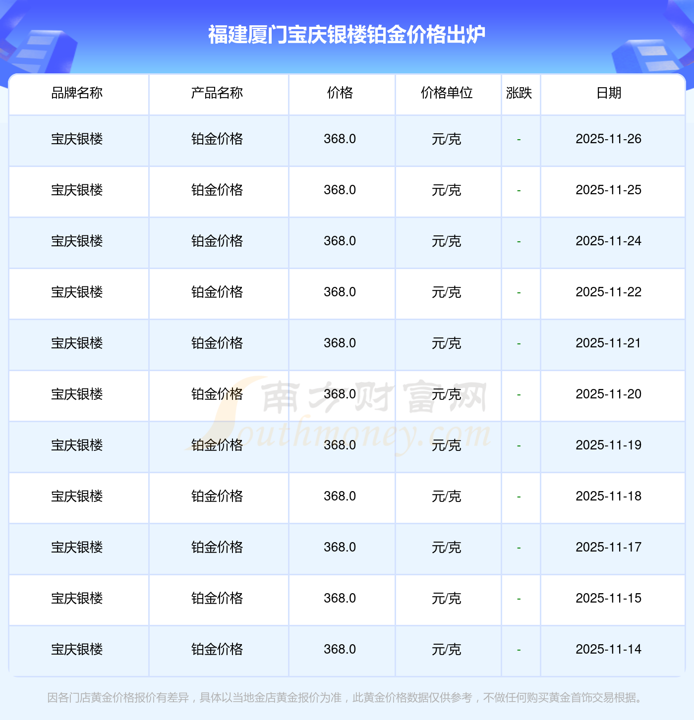 2025年11月26日周生生、潮宏基、潮宏基、周大生、周大生、亞一金店、亞一金店、寶慶銀樓、寶慶銀樓、太陽(yáng)金店、太陽(yáng)金店等各大金店品牌鉑金價(jià)格最新價(jià)格如下:周生生金條金價(jià)(內(nèi)地)1155.0元/克,潮宏基黃金價(jià)格1312.0元/克,潮宏基鉑金價(jià)格624.0元/克,周大生黃金價(jià)格1312.0元/克,周大生鉑金價(jià)格624.0元/克,亞一金店黃金價(jià)格1315.0元/克,亞一金店鉑金價(jià)格600.0元/克,寶慶銀樓黃金價(jià)格1258.0元/克,寶慶銀樓鉑金價(jià)格368.0元/克,太陽(yáng)金店黃金價(jià)格1149.0元/克,太陽(yáng)金店鉑金價(jià)格489.0元/克。
