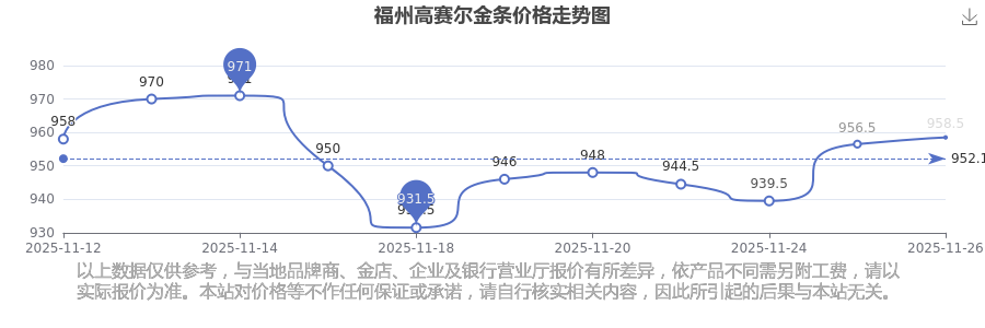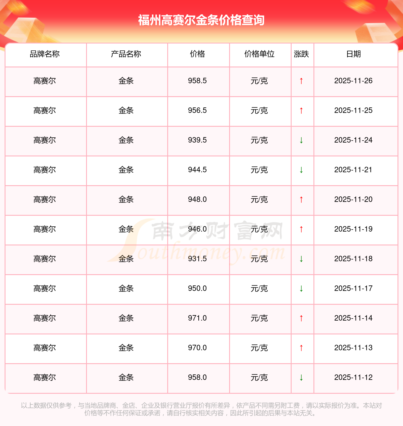 958.5元/克,此乃福州高賽爾于 2025年11月26日金條的掛牌價格。