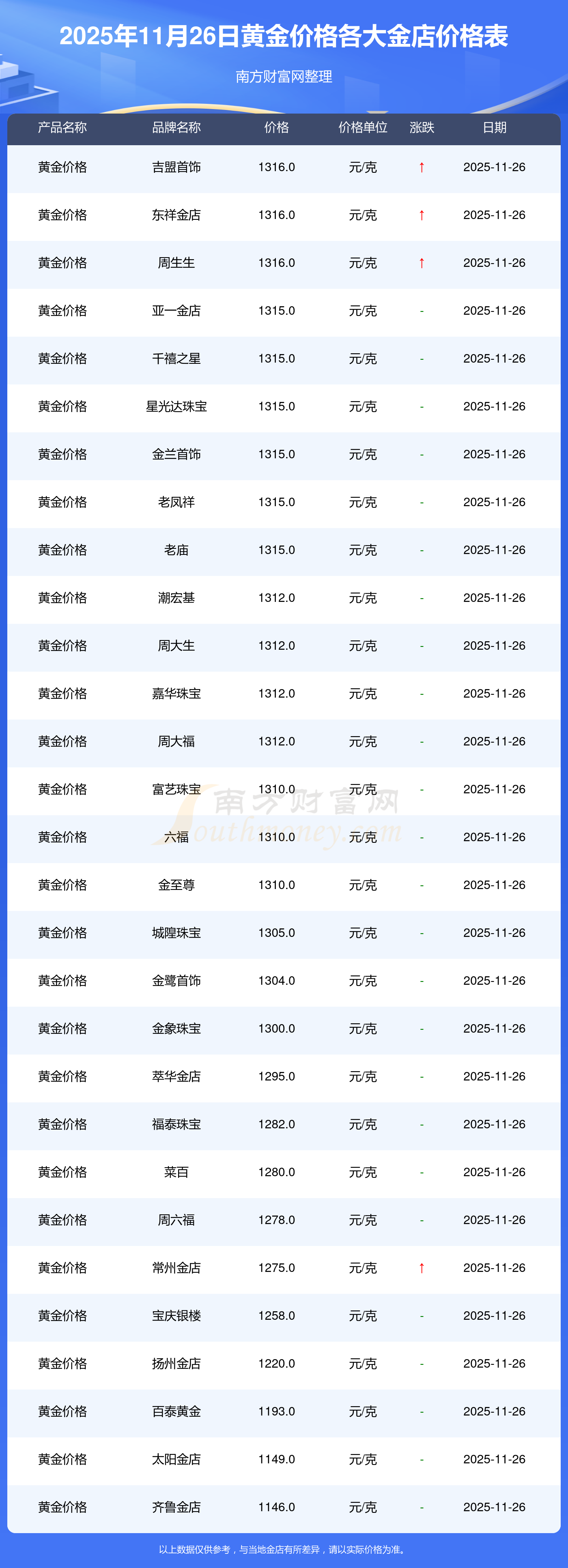 2025年11月26日各大金店黃金價格最新價格:周生生1155.0元/克,潮宏基1312.0元/克,潮宏基624.0元/克,周大生1312.0元/克,周大生624.0元/克,亞一金店1315.0元/克,亞一金店600.0元/克,寶慶銀樓1258.0元/克,寶慶銀樓368.0元/克,太陽金店1149.0元/克,太陽金店489.0元/克。