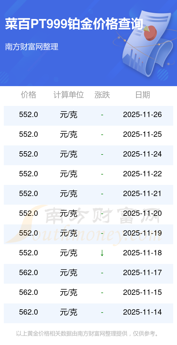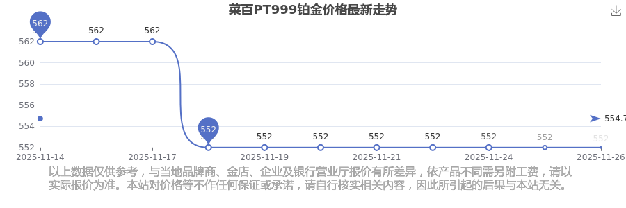 菜百 PT999鉑金于今日的最新掛牌價(jià)為552.0元/克。