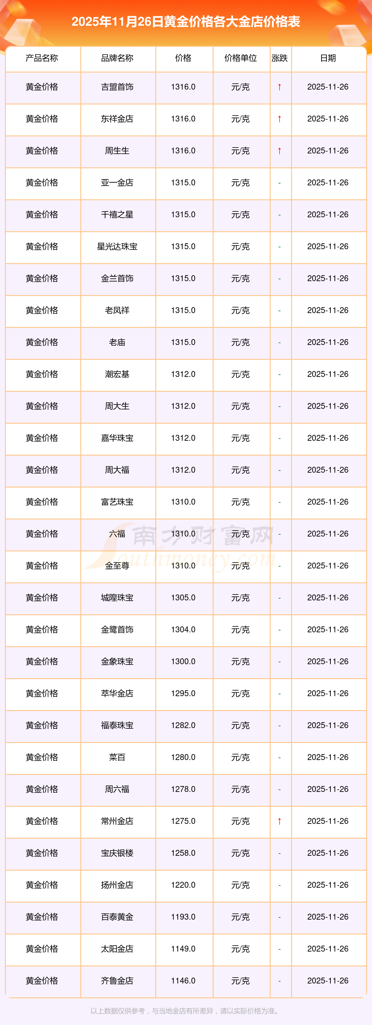 今天是2025年11月26日,周生生、潮宏基、潮宏基、周大生、周大生、亞一金店、亞一金店、寶慶銀樓、寶慶銀樓、太陽金店、太陽金店等各大金店品牌黃金價(jià)格最新價(jià)格如下:周生生1155.0元/克、潮宏基1312.0元/克、潮宏基624.0元/克、周大生1312.0元/克、周大生624.0元/克、亞一金店1315.0元/克、亞一金店600.0元/克、寶慶銀樓1258.0元/克、寶慶銀樓368.0元/克、太陽金店1149.0元/克、太陽金店489.0元/克。