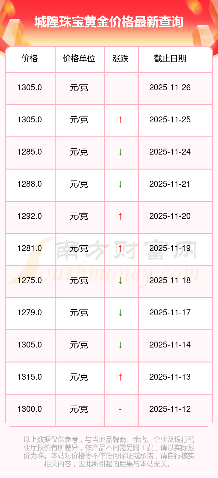 今日黃金價(jià)格查詢_現(xiàn)在金價(jià)黃金一克多少錢(qián),黃金價(jià)格是多少錢(qián)一克?黃金是優(yōu)良的導(dǎo)電導(dǎo)熱材料,有著良好的導(dǎo)熱特性。電子工業(yè)中的特殊電路設(shè)計(jì)常使用它,原因在于它化學(xué)穩(wěn)定性高、抗氧化性強(qiáng),可制作高精度電子元件。目前城隍珠寶 黃金價(jià)格的價(jià)格,今日最新為1305.0元/克。
