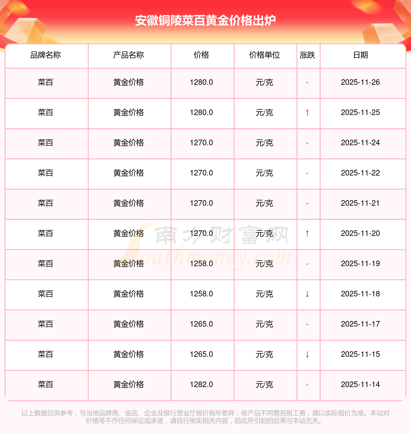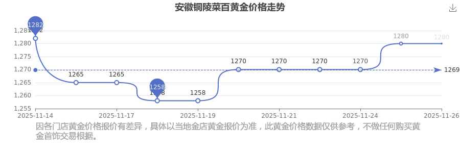 安徽銅陵菜百的黃金價(jià)格在今日(2025年11月26日),每克售價(jià)為1280.0元/克。