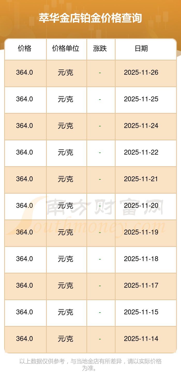 2025年11月26日萃華金店鉑金價格為364.0元/克。