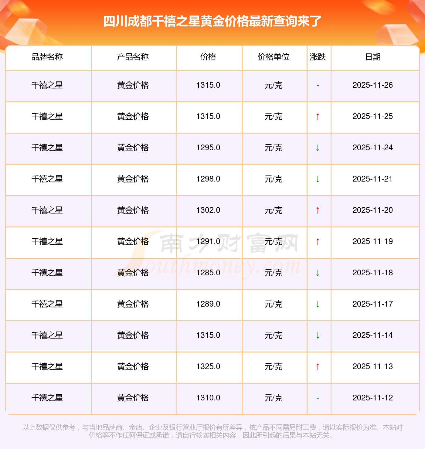 今日四川成都千禧之星黃金價格公布黃金價格今天多少一克今日(2025年11月26日)四川成都千禧之星黃金價格是1315.0元/克。