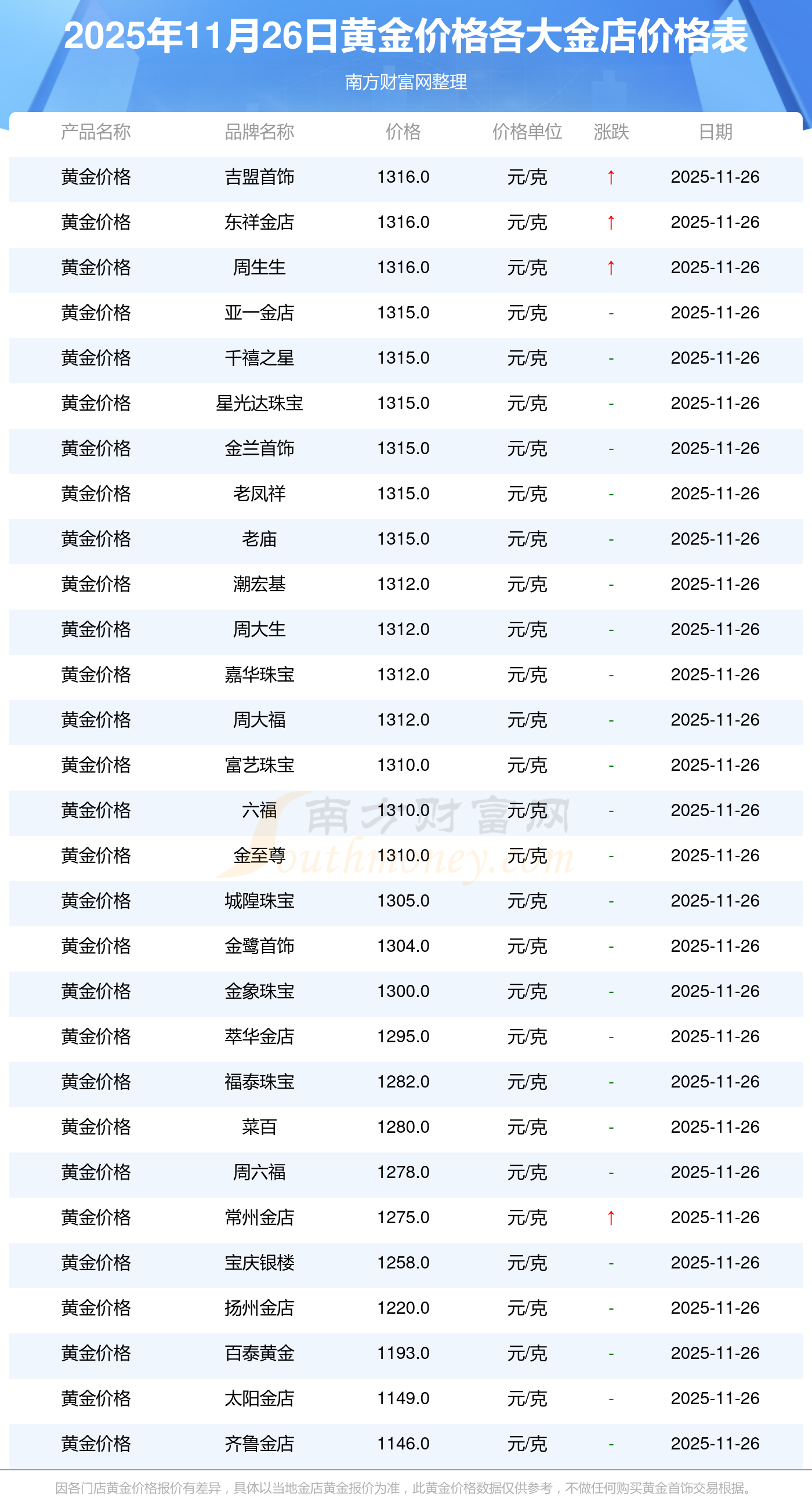 2025年11月26日周生生、潮宏基、潮宏基、周大生、周大生、亞一金店、亞一金店、寶慶銀樓、寶慶銀樓、太陽(yáng)金店、太陽(yáng)金店等各大金店品牌黃金價(jià)格最新價(jià)格如下:周生生金條金價(jià)(內(nèi)地)1155.0元/克,潮宏基黃金價(jià)格1312.0元/克,潮宏基鉑金價(jià)格624.0元/克,周大生黃金價(jià)格1312.0元/克,周大生鉑金價(jià)格624.0元/克,亞一金店黃金價(jià)格1315.0元/克,亞一金店鉑金價(jià)格600.0元/克,寶慶銀樓黃金價(jià)格1258.0元/克,寶慶銀樓鉑金價(jià)格368.0元/克,太陽(yáng)金店黃金價(jià)格1149.0元/克,太陽(yáng)金店鉑金價(jià)格489.0元/克。