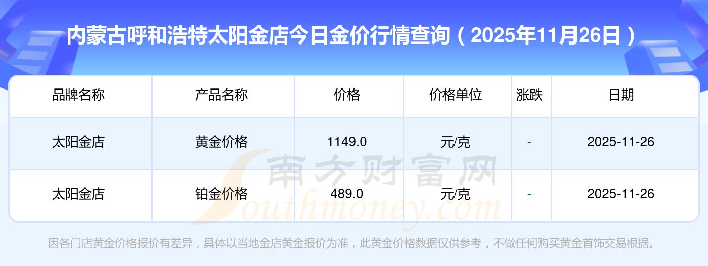 2025年11月26日內(nèi)蒙古呼和浩特太陽(yáng)金店現(xiàn)在購(gòu)買一克黃金需要支付多少錢?金條金價(jià)(內(nèi)地)1155.0元/克,黃金價(jià)格1312.0元/克,鉑金價(jià)格624.0元/克,黃金價(jià)格1312.0元/克,鉑金價(jià)格624.0元/克,黃金價(jià)格1315.0元/克,鉑金價(jià)格600.0元/克,黃金價(jià)格1258.0元/克,鉑金價(jià)格368.0元/克,黃金價(jià)格1149.0元/克,鉑金價(jià)格489.0元/克。