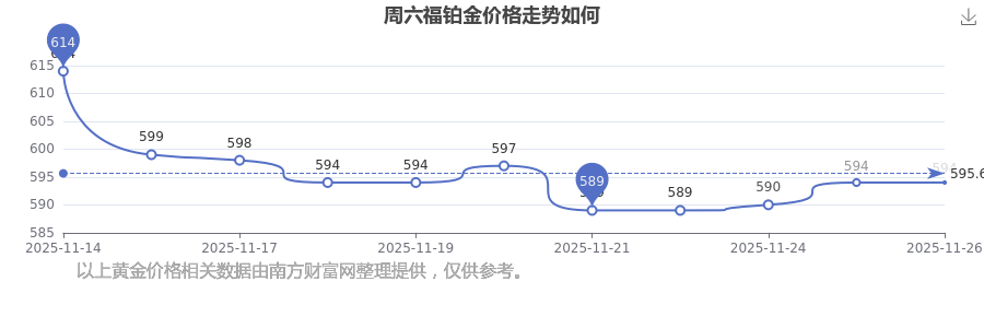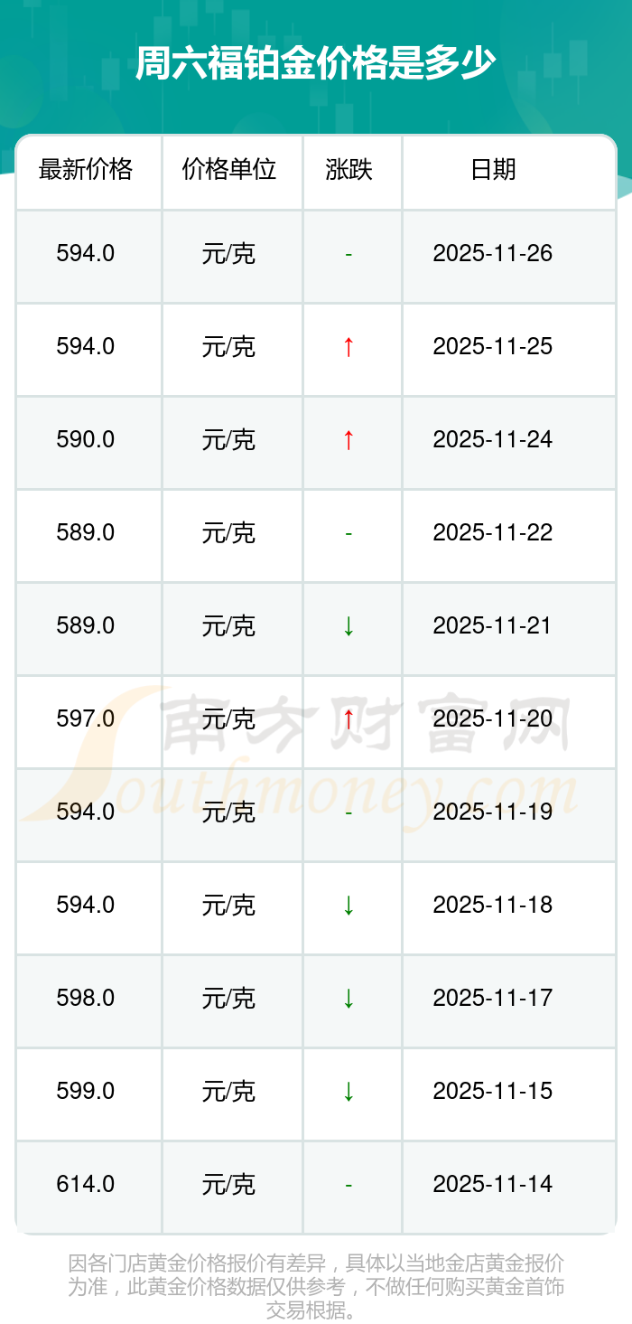 周六福 鉑金價格今日最新的價位是594.0元/克。