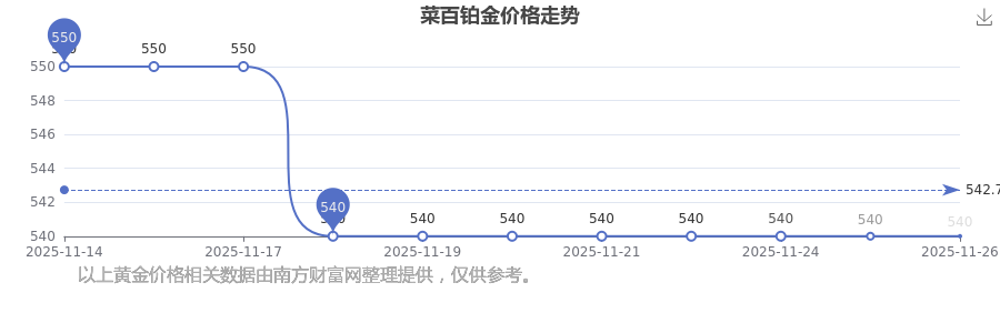 菜百 鉑金價(jià)格在今日的最新價(jià)格顯示為540.0元/克。