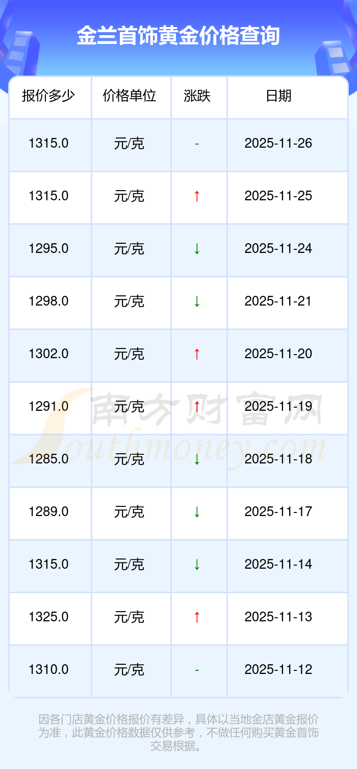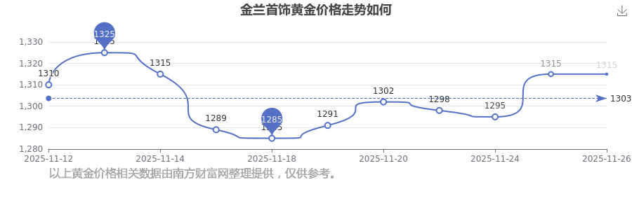 今日黃金價格具體多少?當下每克黃金值多少錢呢?黃金每克的價格大概是多少范圍?今日金蘭首飾黃金價格是1315.0元/克。