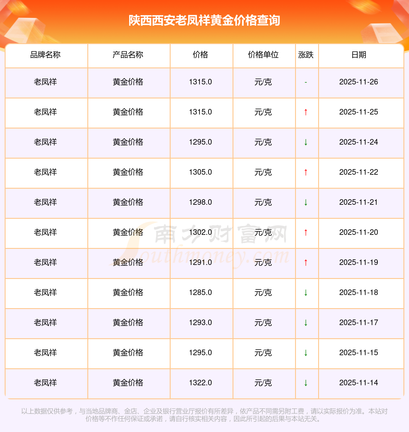 2025年11月26日各大金店黃金價格最新價格:周生生1155.0元/克,潮宏基1312.0元/克,潮宏基624.0元/克,周大生1312.0元/克,周大生624.0元/克,亞一金店1315.0元/克,亞一金店600.0元/克,寶慶銀樓1258.0元/克,寶慶銀樓368.0元/克,太陽金店1149.0元/克,太陽金店489.0元/克。