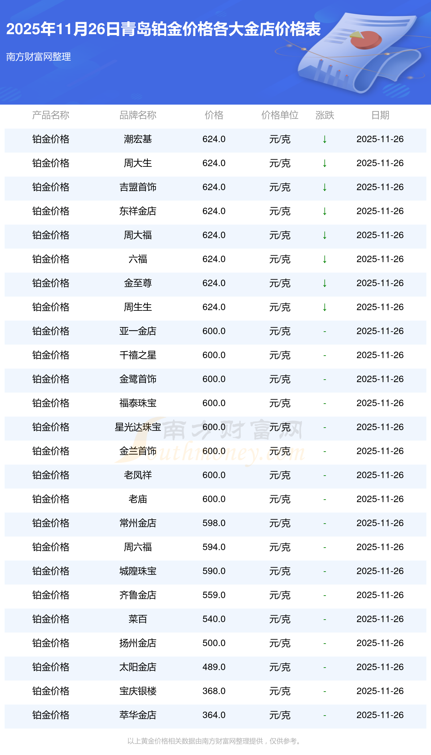 2025年11月26日青島各大金店鉑金價格最新價格:周生生1155.0元/克,潮宏基1312.0元/克,潮宏基624.0元/克,周大生1312.0元/克,周大生624.0元/克,亞一金店1315.0元/克,亞一金店600.0元/克,寶慶銀樓1258.0元/克,寶慶銀樓368.0元/克,太陽金店1149.0元/克,太陽金店489.0元/克。
