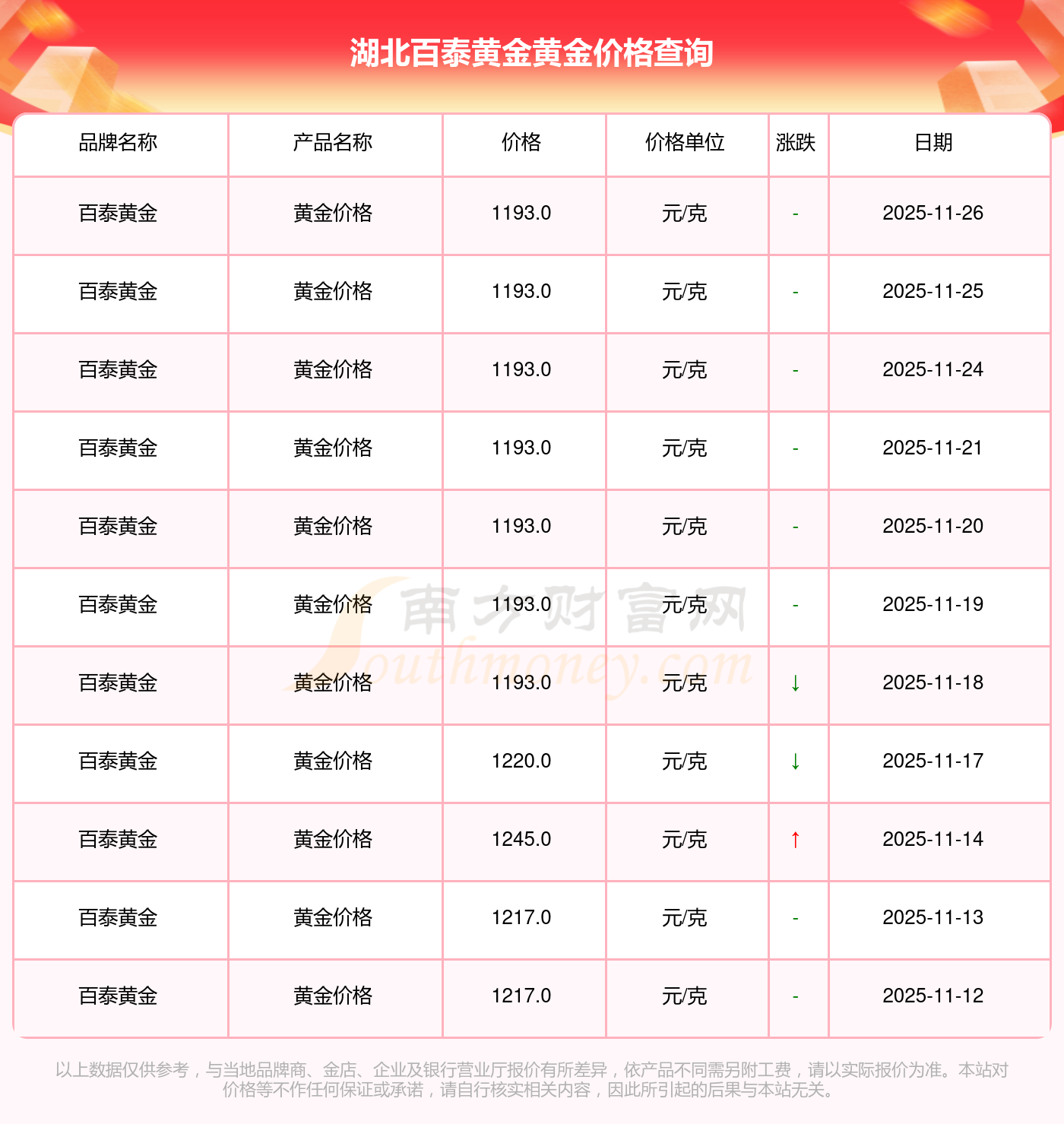 今日(2025年11月26日),1193.0元/克是湖北百泰黃金黃金價格的價格標(biāo)準(zhǔn)。