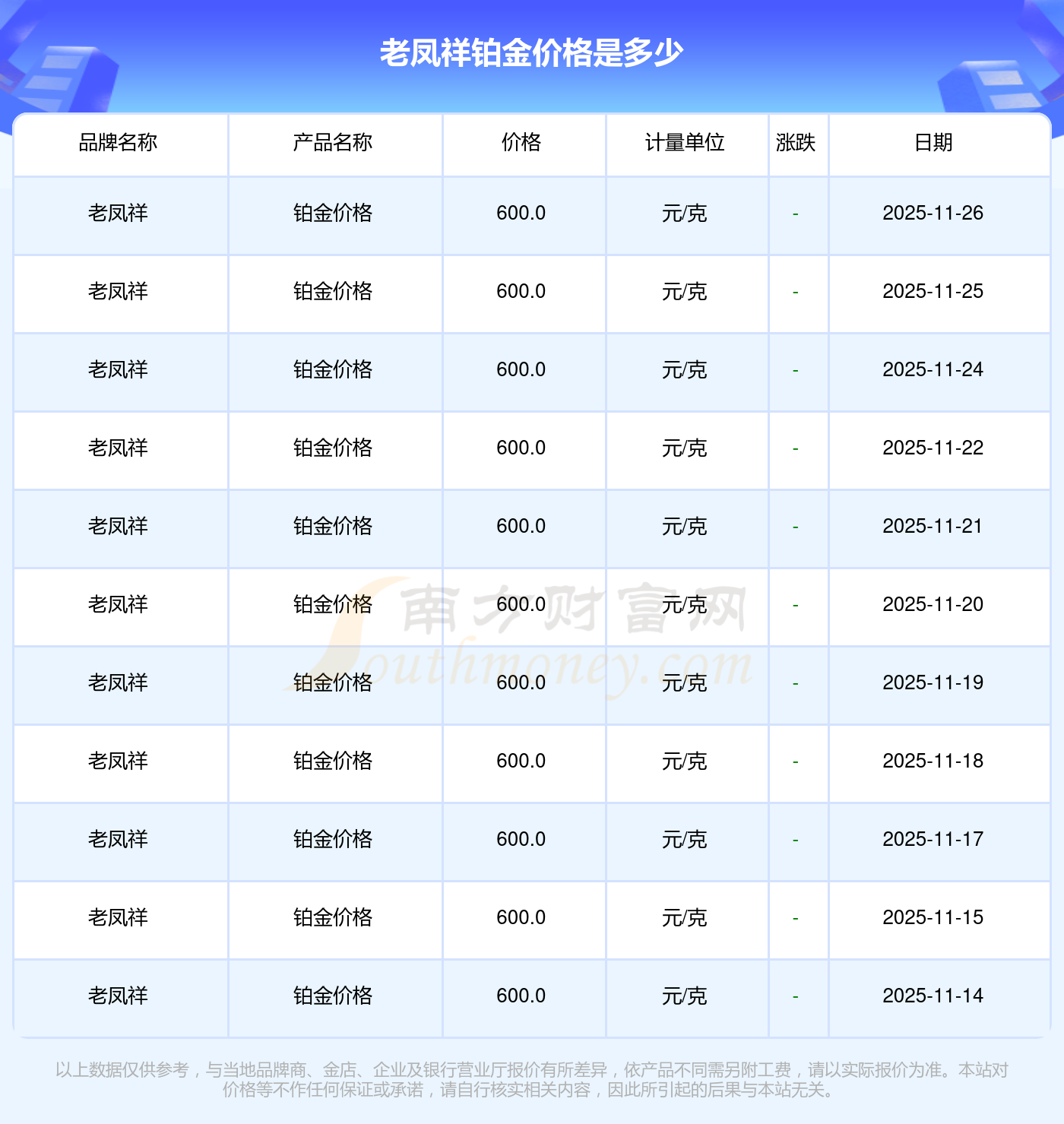 今日(2025年11月26日)老鳳祥鉑金價格是600.0元/克。