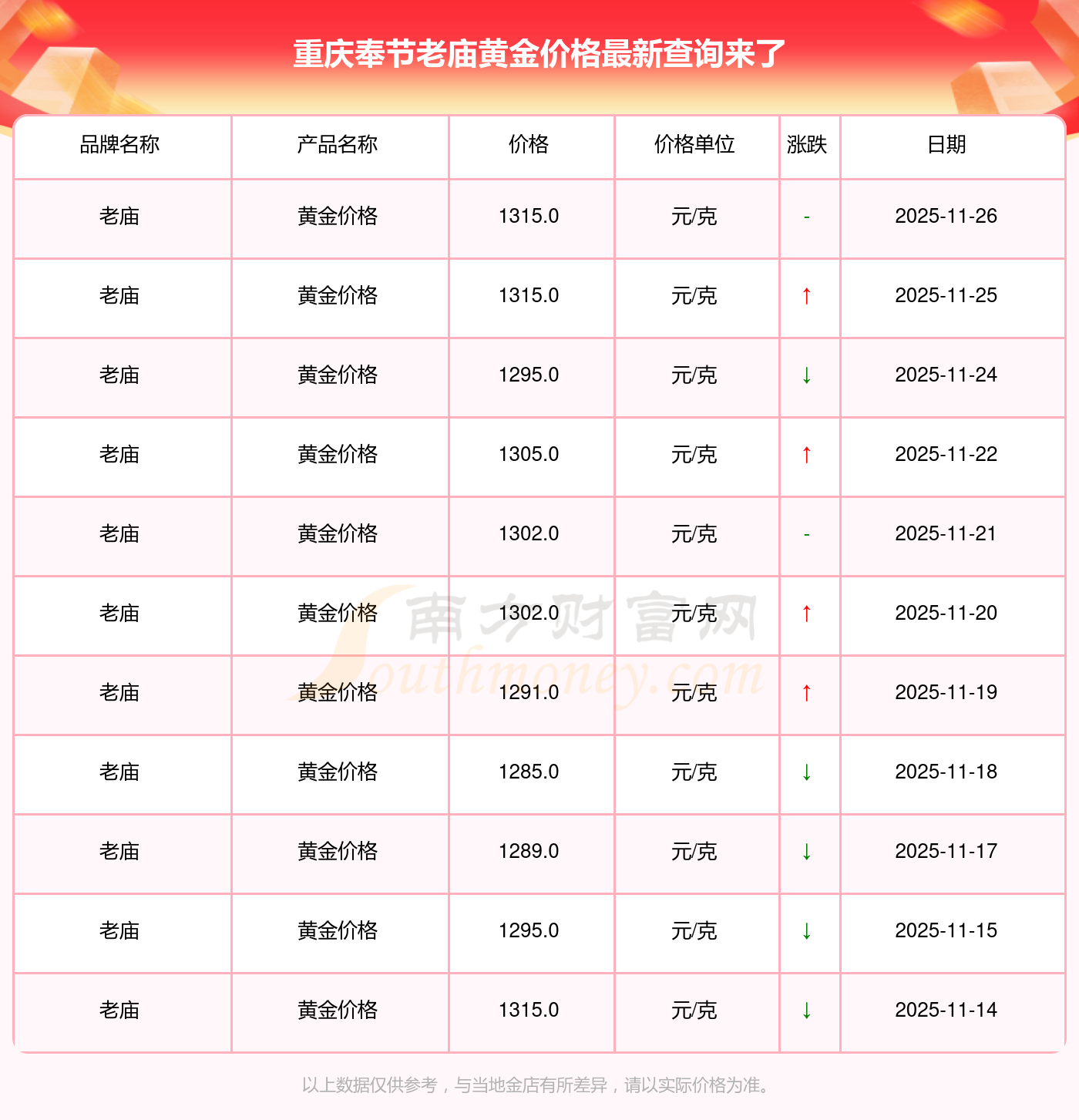 1315.0元/克,這是重慶奉節(jié)老廟于 2025年11月26日所定的黃金價(jià)格。