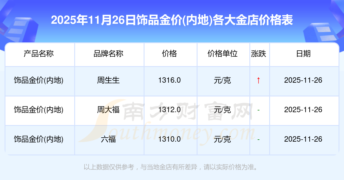 2025年11月26日周生生、潮宏基、潮宏基、周大生、周大生、亞一金店、亞一金店、寶慶銀樓、寶慶銀樓、太陽金店、太陽金店等各大金店品牌飾品金價(內地)最新價格如下:周生生金條金價(內地)1155.0元/克,潮宏基黃金價格1312.0元/克,潮宏基鉑金價格624.0元/克,周大生黃金價格1312.0元/克,周大生鉑金價格624.0元/克,亞一金店黃金價格1315.0元/克,亞一金店鉑金價格600.0元/克,寶慶銀樓黃金價格1258.0元/克,寶慶銀樓鉑金價格368.0元/克,太陽金店黃金價格1149.0元/克,太陽金店鉑金價格489.0元/克。