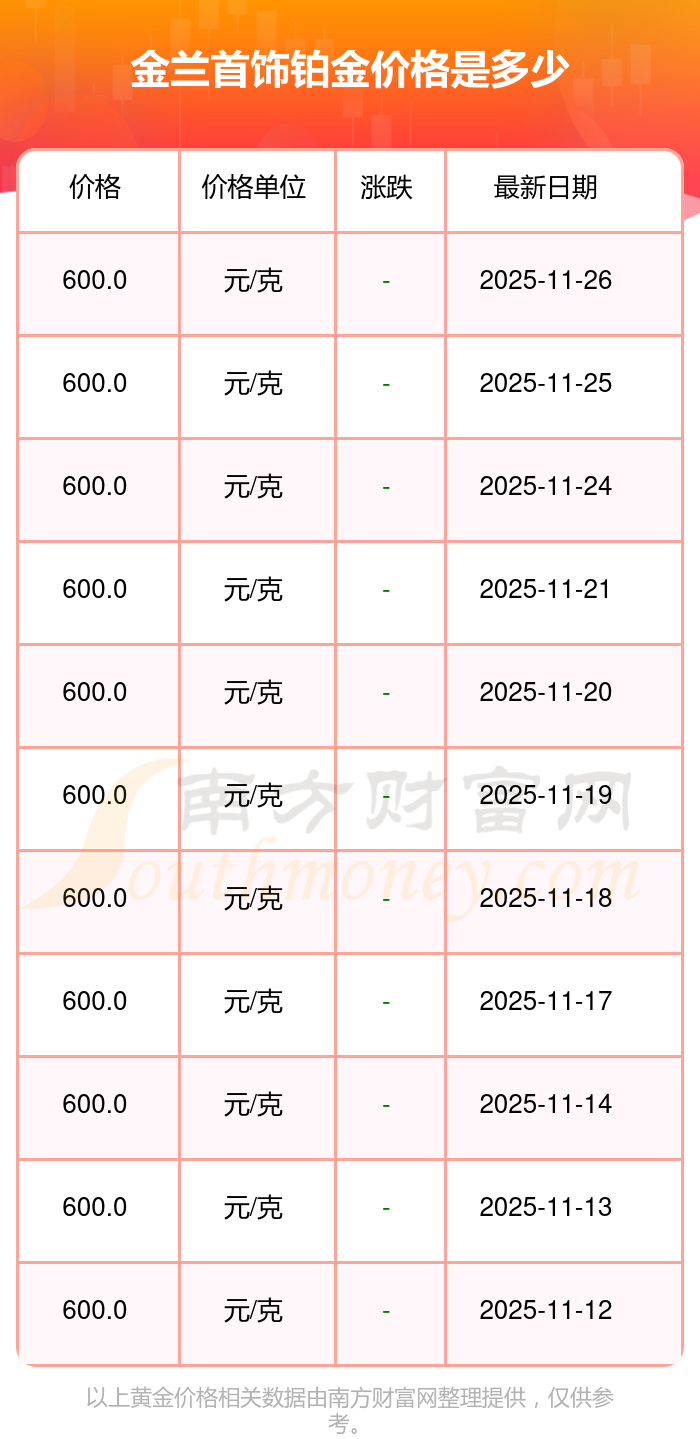 2025年11月26日金蘭首飾鉑金價(jià)格為600.0元/克。