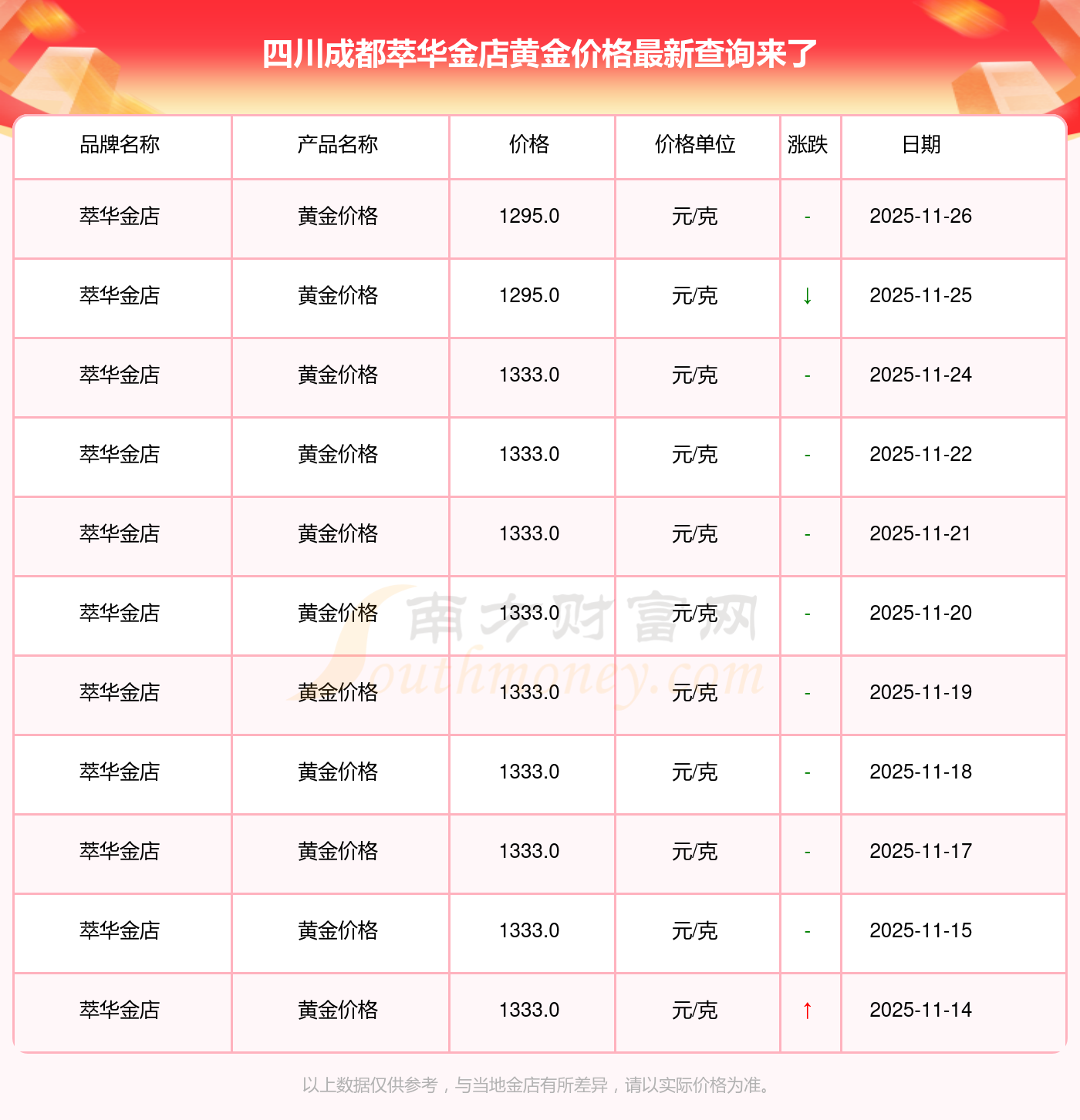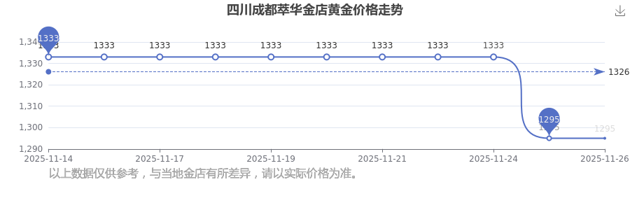 四川成都萃華金店在 2025年11月26日的黃金價(jià)格零售價(jià)格為 1295.0元/克。