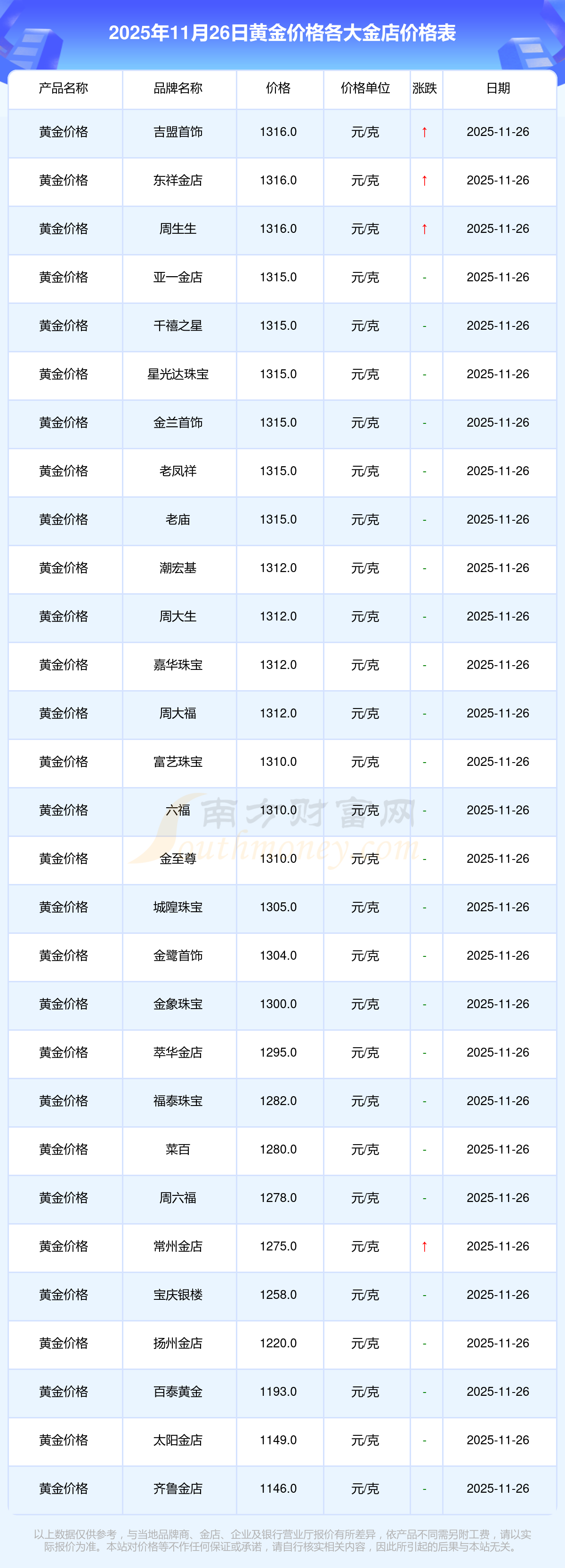 2025年11月26日,周生生、潮宏基、潮宏基、周大生、周大生、亞一金店、亞一金店、寶慶銀樓、寶慶銀樓、太陽金店、太陽金店等各大金店品牌黃金價(jià)格今日價(jià)格如下:周生生1155.0元/克、潮宏基1312.0元/克、潮宏基624.0元/克、周大生1312.0元/克、周大生624.0元/克、亞一金店1315.0元/克、亞一金店600.0元/克、寶慶銀樓1258.0元/克、寶慶銀樓368.0元/克、太陽金店1149.0元/克、太陽金店489.0元/克。