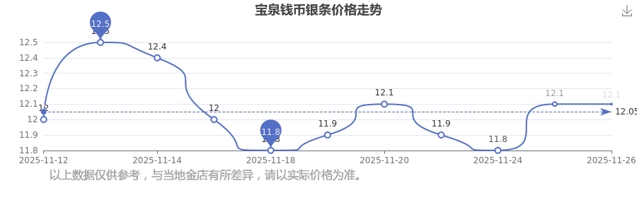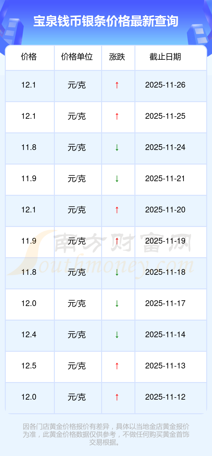 今日(2025年11月26日),寶泉錢幣銀條價(jià)格最新價(jià)格為12.1元/克。
