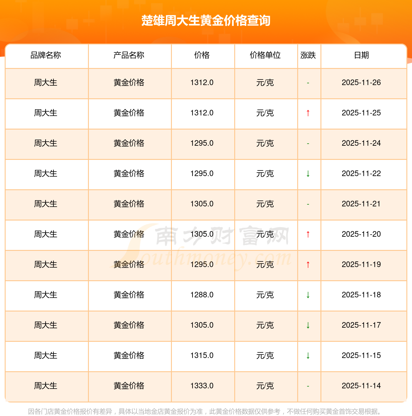 2025年11月26日周生生、潮宏基、潮宏基、周大生、周大生、亞一金店、亞一金店、寶慶銀樓、寶慶銀樓、太陽(yáng)金店、太陽(yáng)金店等各大金店品牌黃金價(jià)格最新價(jià)格如下:周生生金條金價(jià)(內(nèi)地)1155.0元/克,潮宏基黃金價(jià)格1312.0元/克,潮宏基鉑金價(jià)格624.0元/克,周大生黃金價(jià)格1312.0元/克,周大生鉑金價(jià)格624.0元/克,亞一金店黃金價(jià)格1315.0元/克,亞一金店鉑金價(jià)格600.0元/克,寶慶銀樓黃金價(jià)格1258.0元/克,寶慶銀樓鉑金價(jià)格368.0元/克,太陽(yáng)金店黃金價(jià)格1149.0元/克,太陽(yáng)金店鉑金價(jià)格489.0元/克。